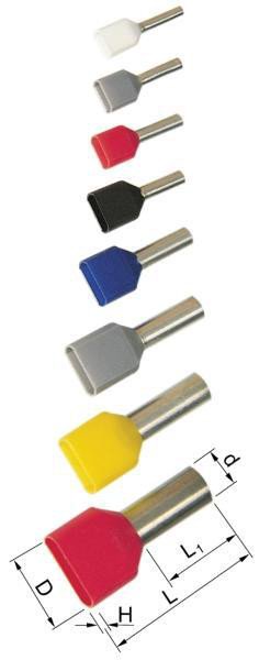Isoleret ABIKO TWIN-terminalrør KA2,5-13ETW2. Materiale: Cu 99,95%, fortinnet. Isoleringsfarve: Blå. Til 2x2,5mm² Cu-leder iht. DIN46228. Længde 13mm.