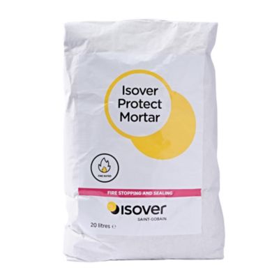 Isover Protect Mortar er en tør, hvid gipsmørtel, der består af uorganiske komponenter og perlit. Når den blandes med vand, dannes en yderst varmeisolerende brandforseglingsmasse.