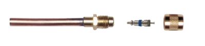 Schraeder ventil med loddet kobberprocesrør. Leveres inklusive hætte og ventilkegle.