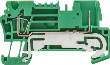 Rækkeklemme PE, 2,5mm2, fjederterminal, gul/grøn, 1 fast terminal og 1 afmonterbar terminal.