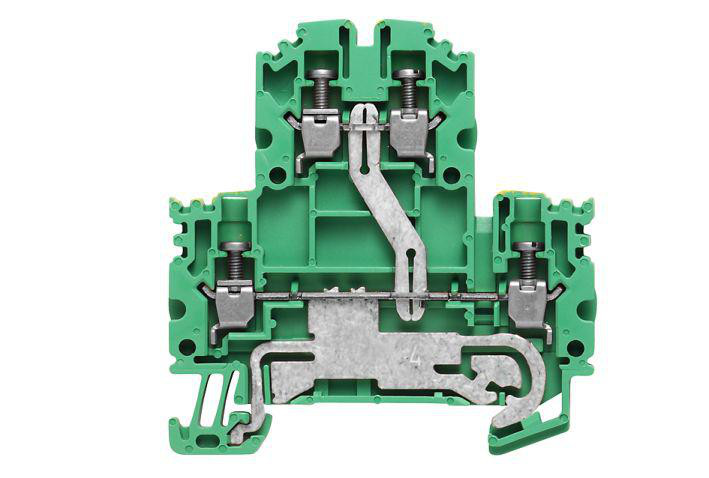 Flerlags PE-terminal med skrueforbindelse. Grøn/gul, 2,5 mm², 800 V, 4 forbindelser og 2 niveauer.