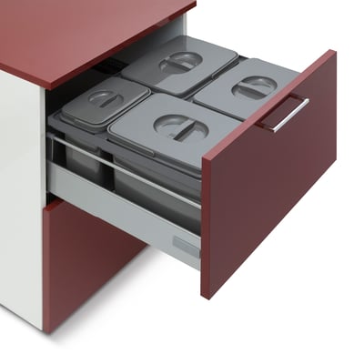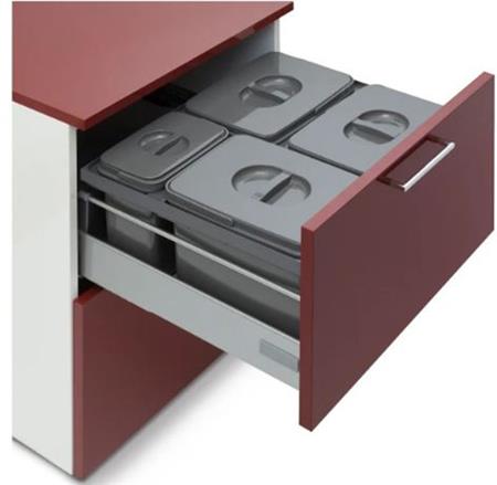 JAZZ60-4 affaldssystem til skuffeskab. Med aftagelige låg og farvede håndtag. Indeholder tre store (12 liter) og en lille (5 liter) affaldsbeholder.