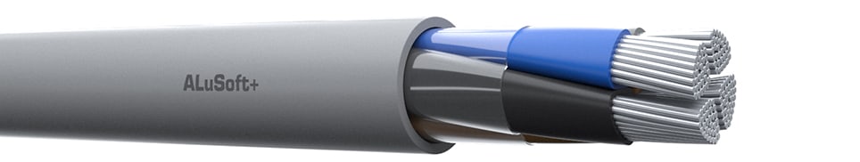Alusoft+ installationskabel med 4x25 aluminiumsledere, XLPE-isolation og en nominel diameter på 24 mm. Ideelt til lavspændingsinstallationer både indendørs og udendørs, samt i jord. Røgsvagt og ugiftigt ved brand.