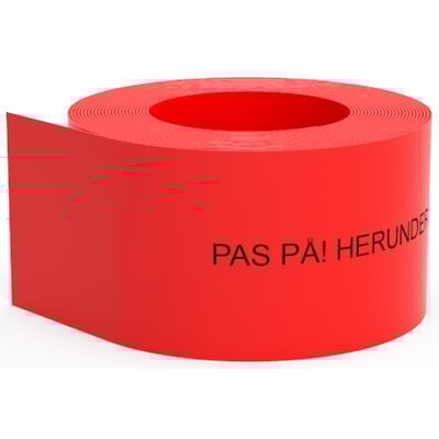 Praktisk kabelafdækning i rød til stærkstrøm. Måler 100 mm i bredden og 1,8 mm i tykkelsen, leveres i 50 meter ruller.