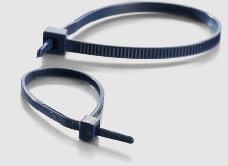Blå kabelbinder CB-DT 100/2.5 BL, 100x2.5mm, til fødevareindustrien. Detekteres af metal- og røntgendetektorer. Korrosionsbestandigt metalfyldstof.