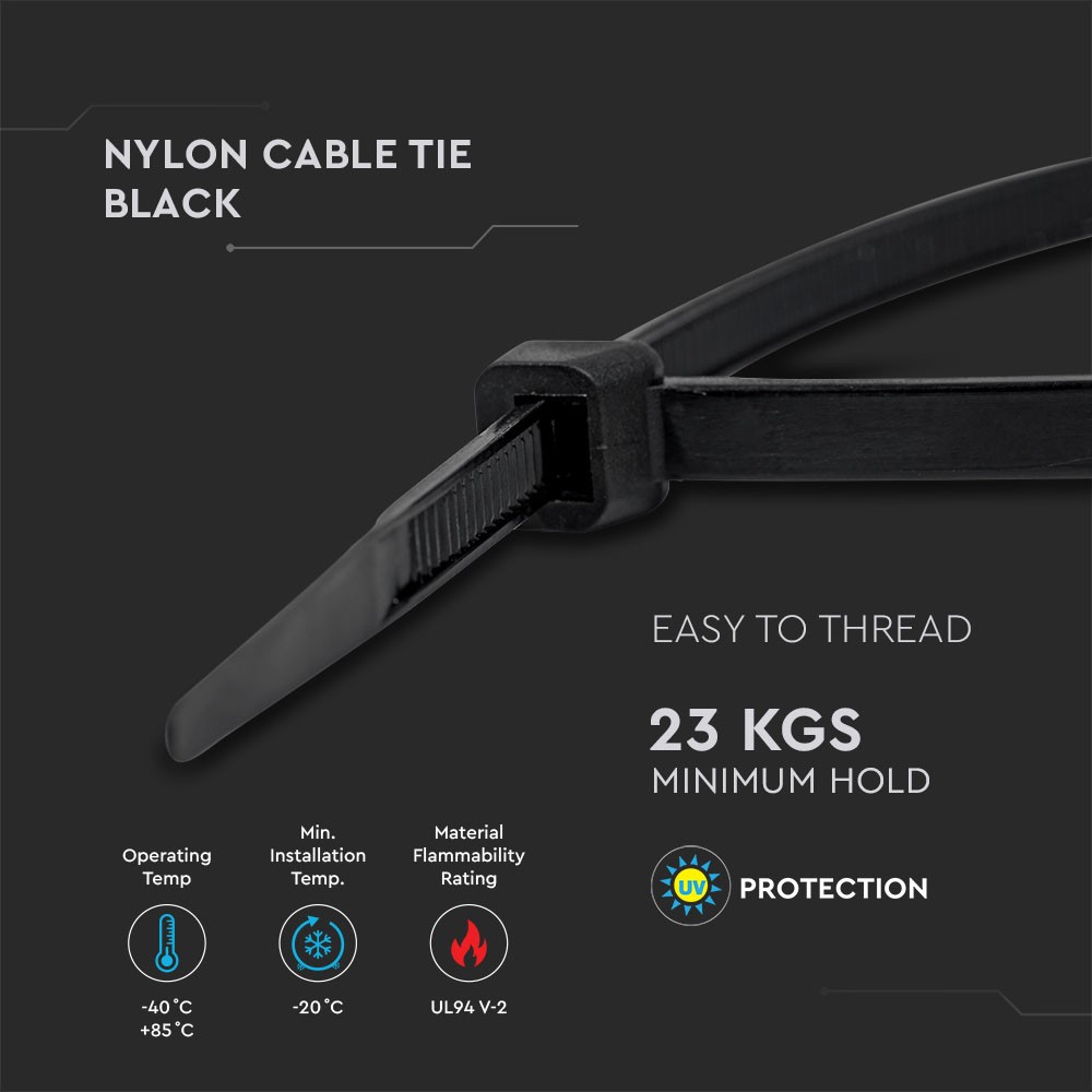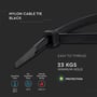 Sorte kabelbindere i slidstærkt NYLON 66, med UL94-V2 brandklassificering. Perfekte til sikker og organiseret kabelføring. Pakke med 100 stk.