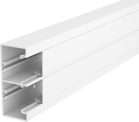 Installationskanal fra OBO Bettermann bestående af en kanaloverdel og en -underdel. Den er designet med bundperforering, hvilket muliggør direkte vægmontering.
