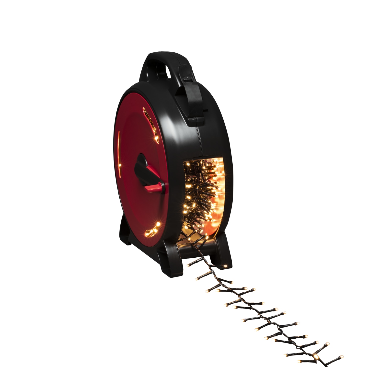 Lyskæden leveres på en praktisk kabeltromle, som gør den nem at opbevare og rulle ud. Transformer medfølger.