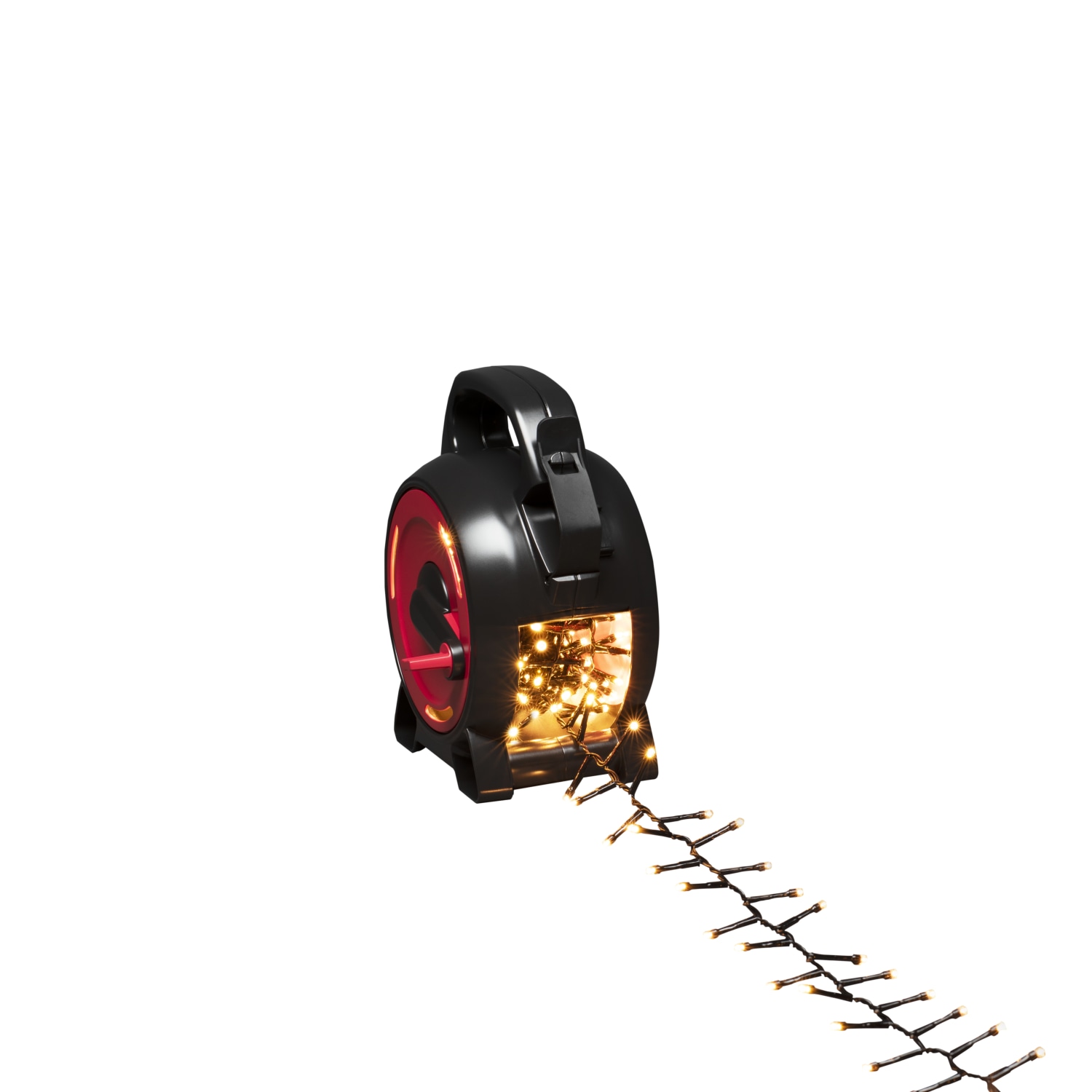 Lyskæden leveres på en praktisk kabeltromle, som gør den nem at opbevare og rulle ud. Transformer medfølger.