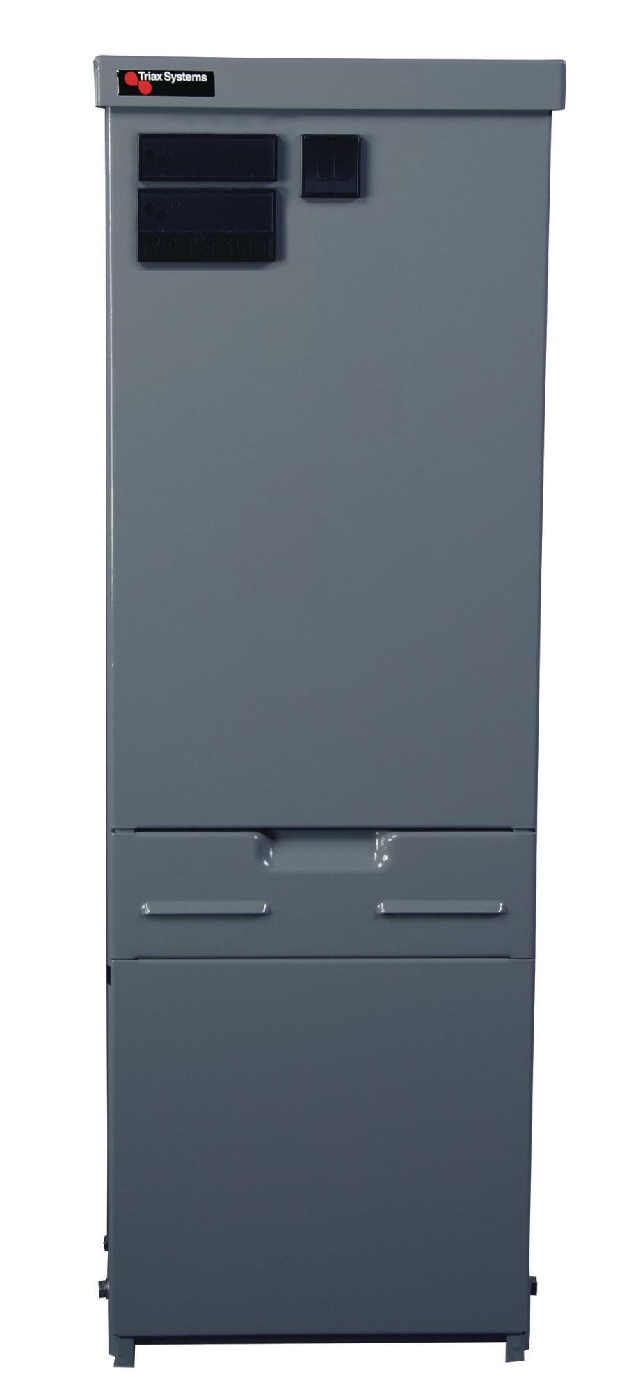 Triarca kabelfordelingsskab i sendzimir galvaniseret stål med rustfrit stål tag og Rilsanbelægning. Testet med 5,25 kV. Mål: 392x700x198 mm.