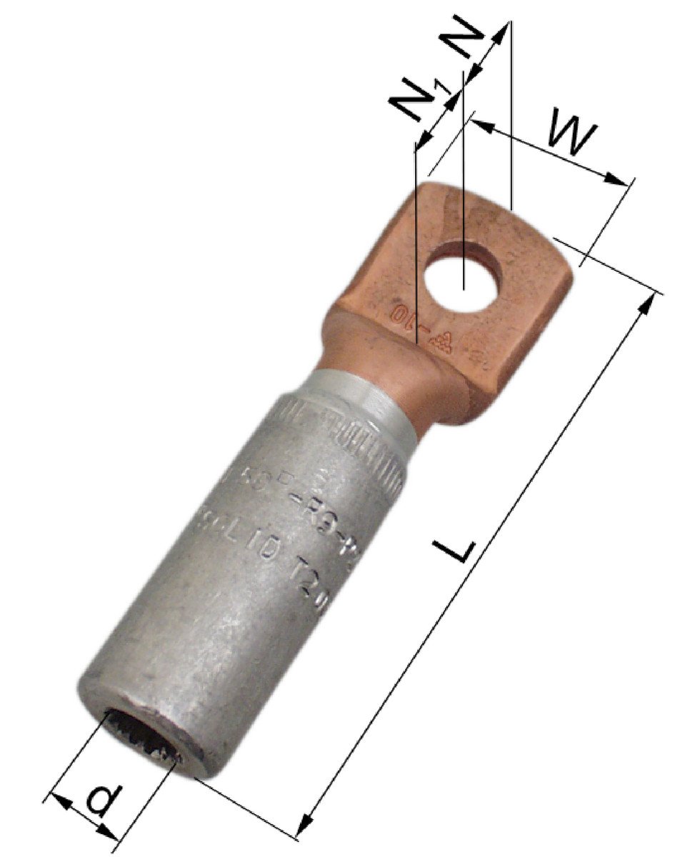 Aluminium kabelsko med kobberlaske AKK500A-16 til 500mm2 fåtrådige (klasse 2) Al-leder. Laske M16. Rundpresning af leder kræves.
