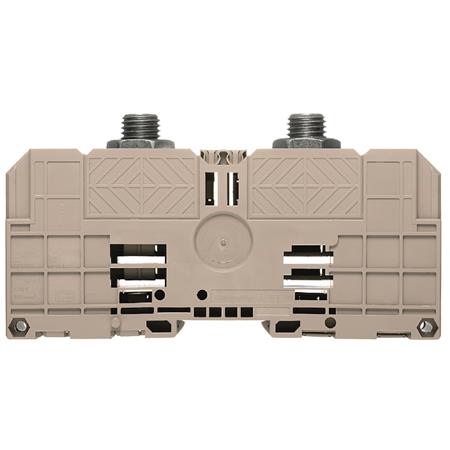 Kabelskoklemme WFF300 i beige. Tilslutning 25-300 mm², 1000V, 520A. Monteres på TS 35 DIN skinne. Bolt klemme type.