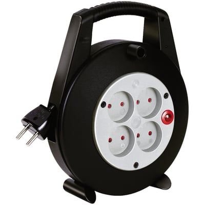 Praktisk kabeltromle med 20 meter ledning, 4 udtag uden jord og integreret termosikring. Ideel til mange formål.