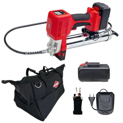 Kraftfuld akku fedtpresse på 21V med 4,0Ah lithium-ion batteri. Kan bruges med standard 400g patroner, løst fedt eller SIC patroner. Leveres i praktisk taske.