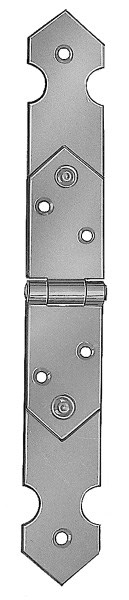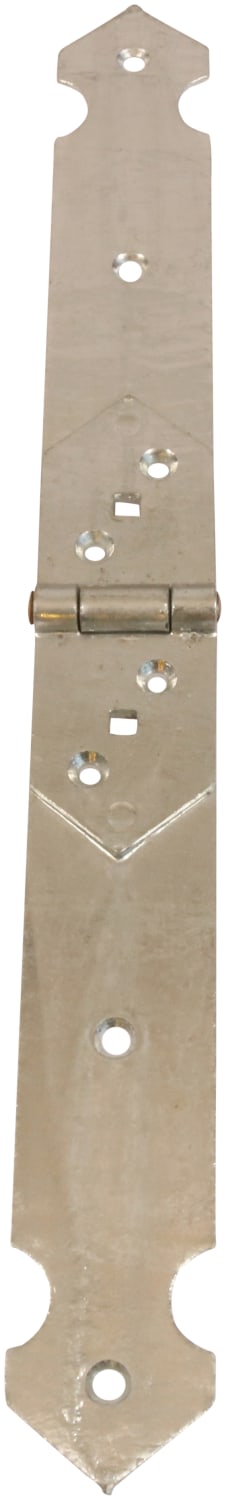 Galvaniseret kælderhængsel (13163) med dimensionerne 50 x 465 mm. Hængslet har skarpe hjørner og er fremstillet i stål med fast messing tap.