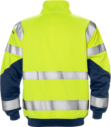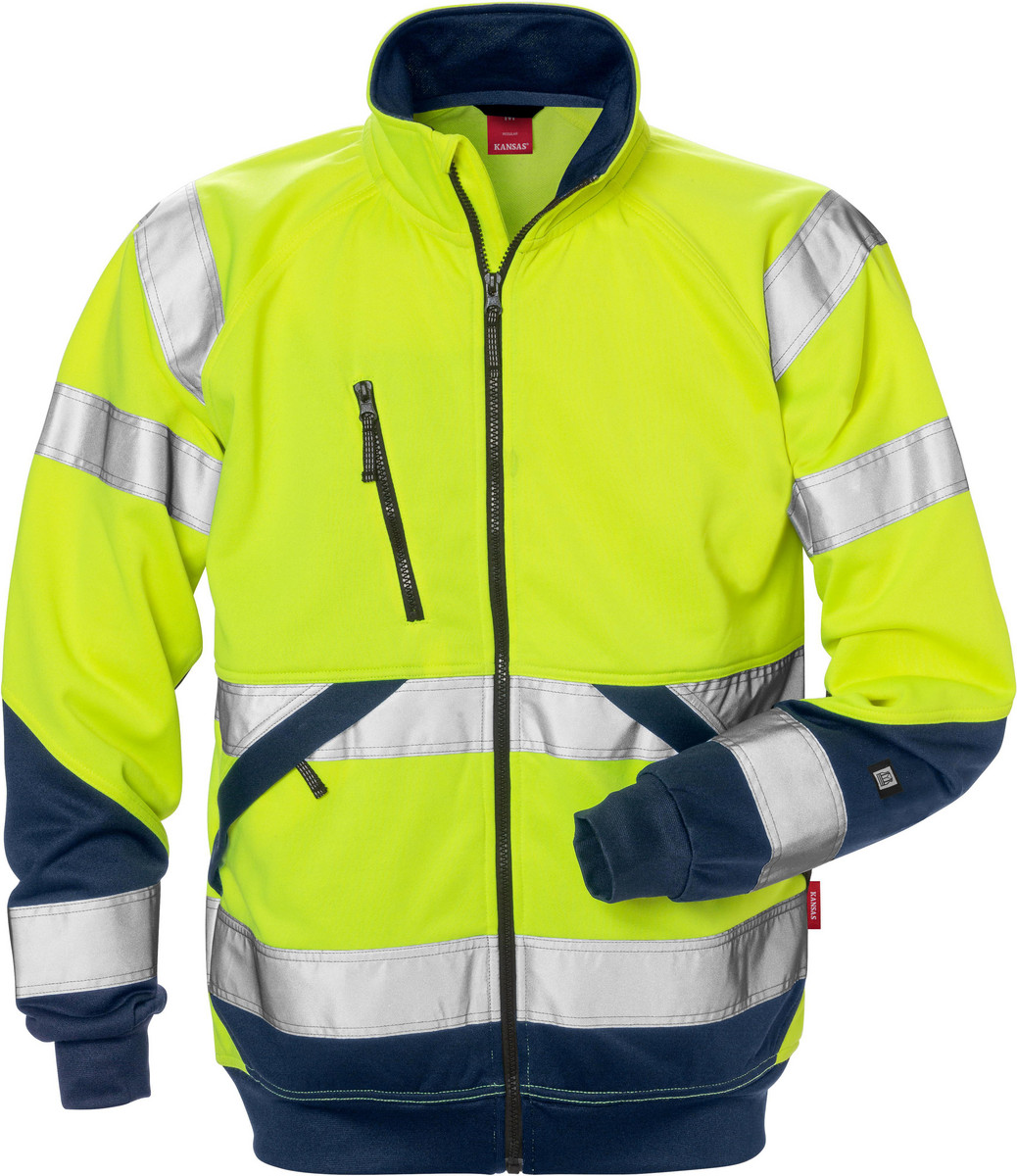Praktisk hi vis sweatjakke med lynlås, brystlomme og to forlommer. Elastisk talje og manchetter. Godkendt efter EN ISO 20471 klasse 2/3.