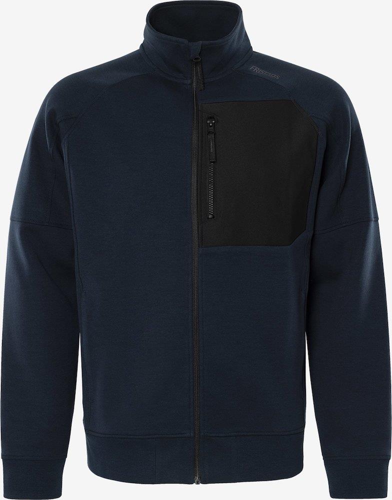 Komfortabel sweatjakke med lynlås i fuld længde. Fremstillet af 60% bomuld og 40% genanvendt polyester i et blødt, dobbeltsidet materiale. Med brystlomme og forlommer med lynlås.