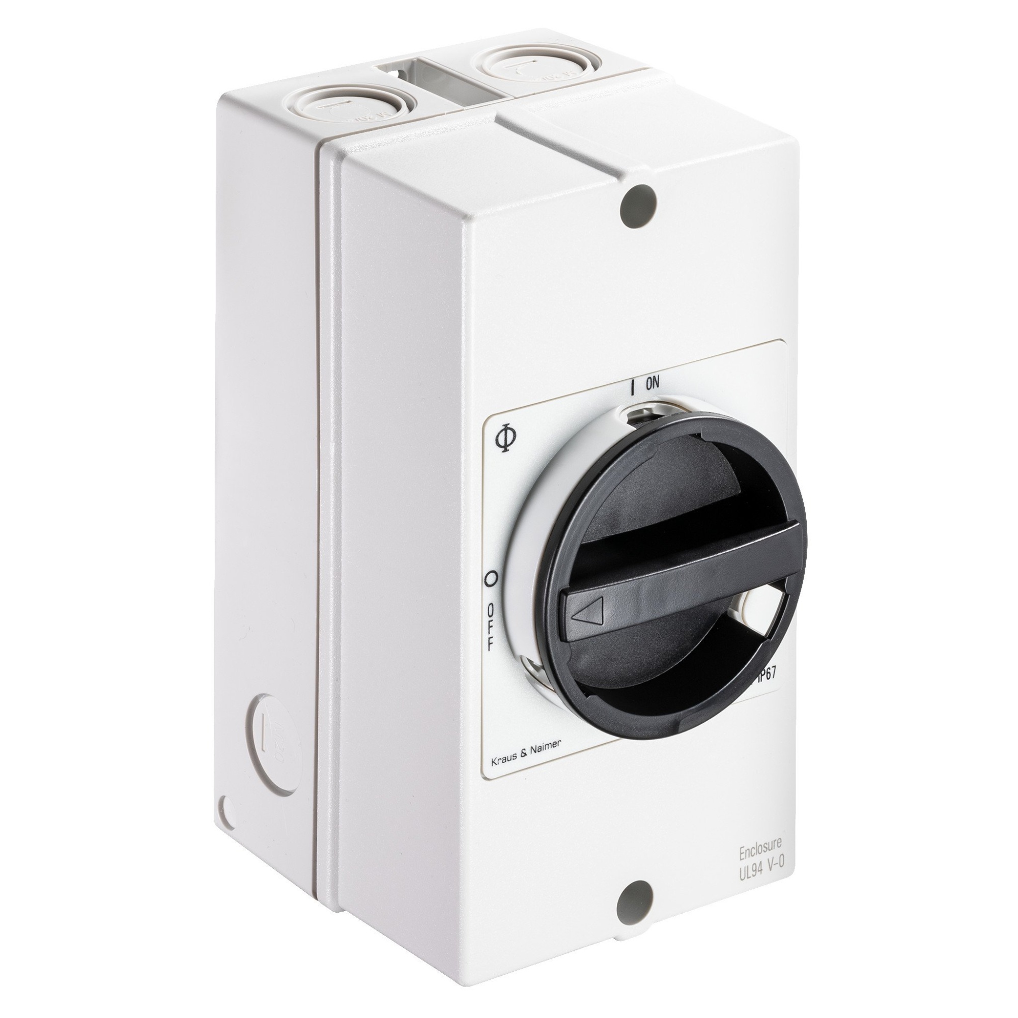 Kraus & Naimer kvalitets vedligeholdelsesafbryder, 32A, 3 poler, IP66, IP67, IP69k front, med sort/gråt håndtag i hårdt plastkabinet. Plastkabinetter med høj mekanisk stabilitet, høj UV-modstand og god montageplads i terminalrummet.