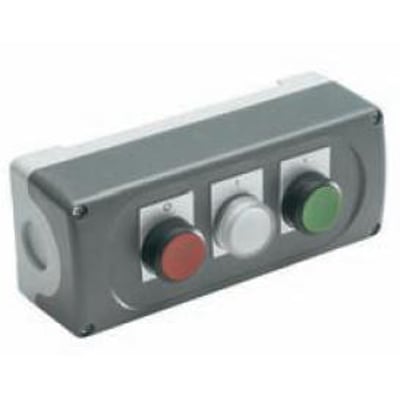Plast kapsling fra ABB's PDA trykknap-serie. Komplet enhed bestående af trykknap/lampe/drejeomskifter som monteres forfra. Nem montage uden brug af værktøj.