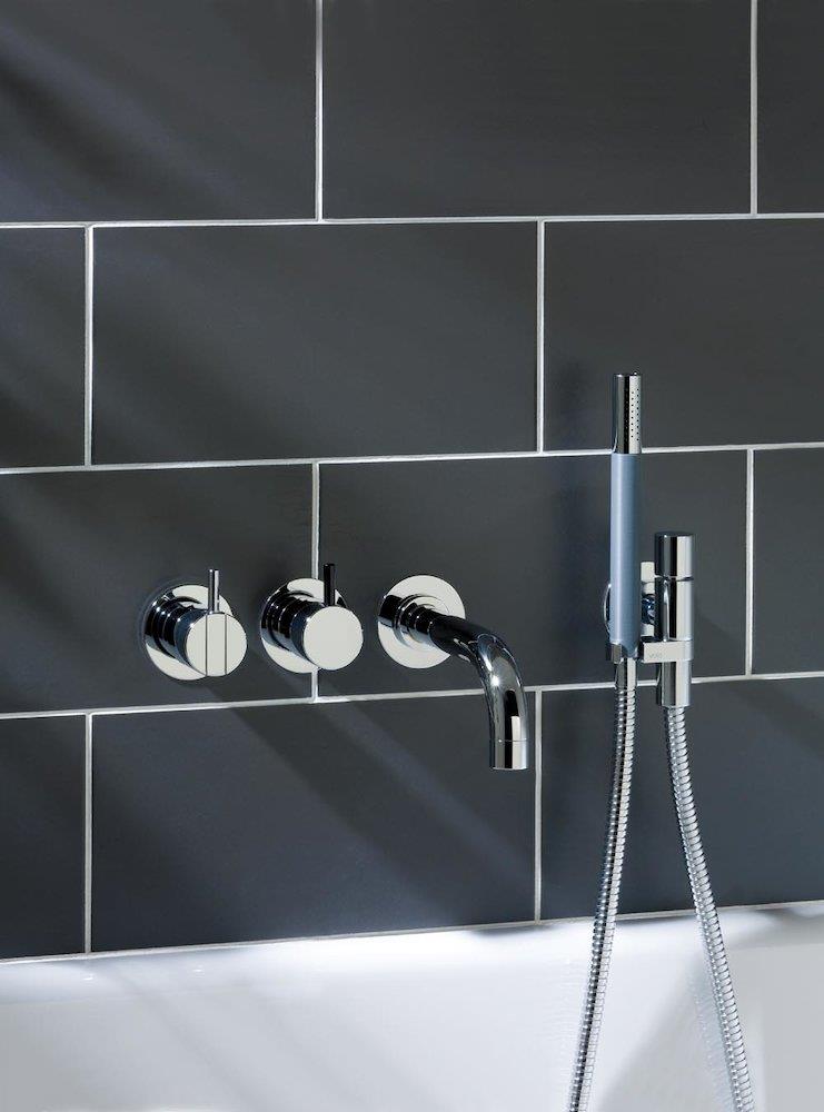 Elegant et-grebs kararmatur fra Vola med keramisk ventilenhed, omskifter og håndbruser. Fast tud på 160 mm og krom finish.