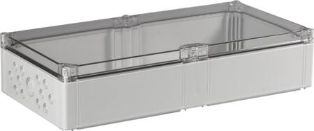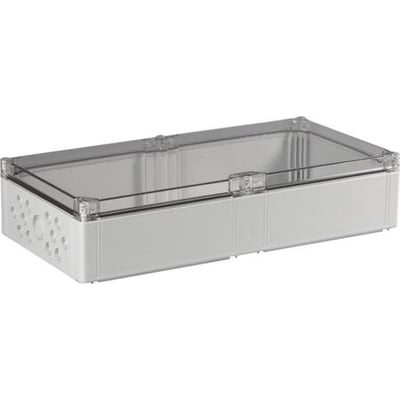 Grå montagekasse fra Ensto, 300x600x132 mm, med transparent låg og metriske udslagsblanketter. Inkluderer udslagsblanketter: 8xM12/20, 5xM16/25, 12xM12/20 og 1xM32/40.