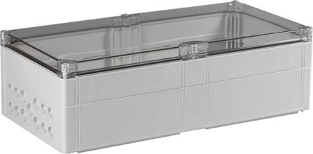 Komplet vægskab montagekasse Cubo O i polycarbonat, 300x600x185 mm, grå RAL7035 med transparent højt låg og udslagsblanketter. IP66/67.