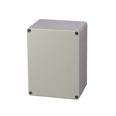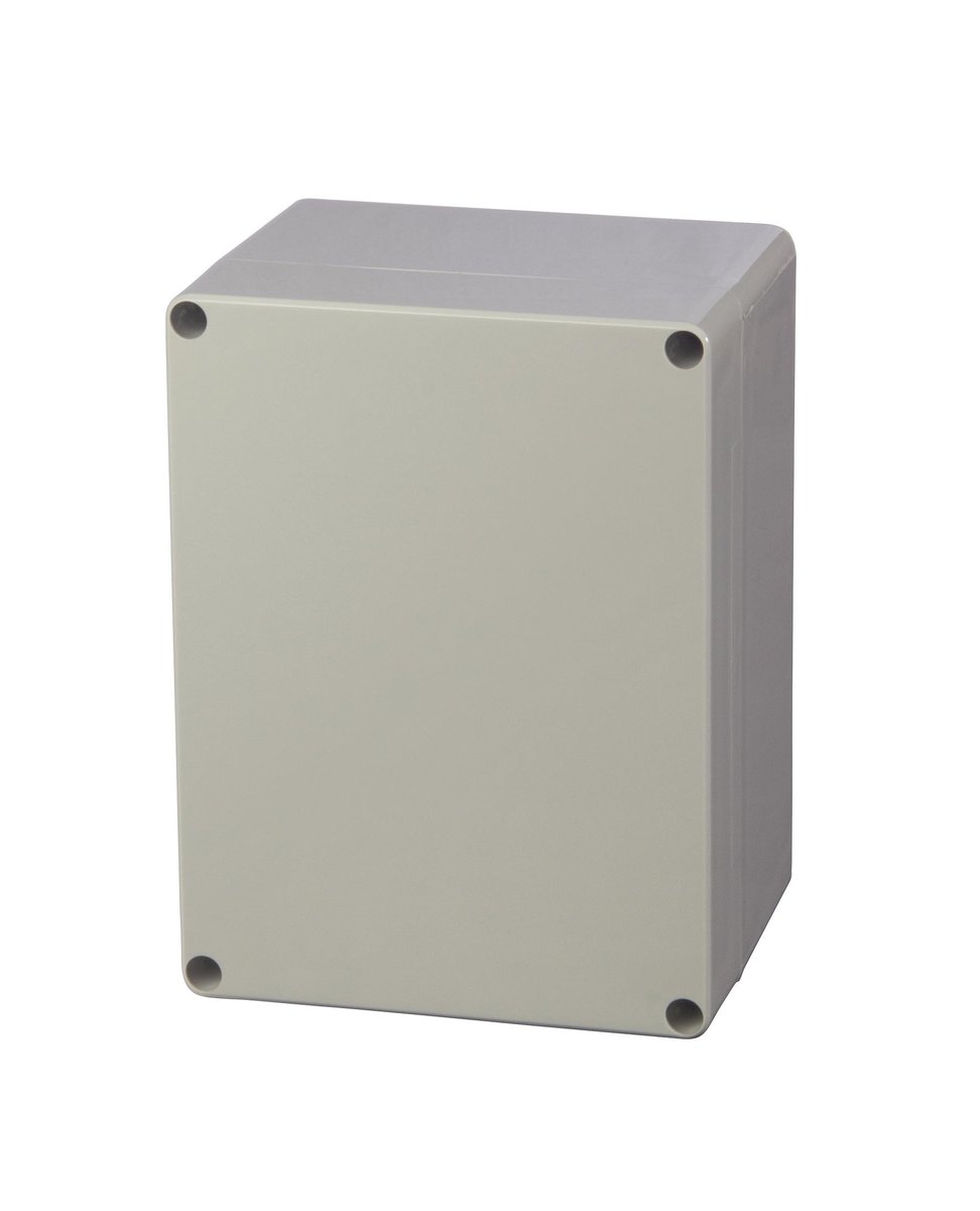 Polycarbonat montageboks 120x160x140 mm med gråt låg. IP66/IP67 klassificeret, inkl. skruer til montageplade/DIN-skinne og PUR pakning.