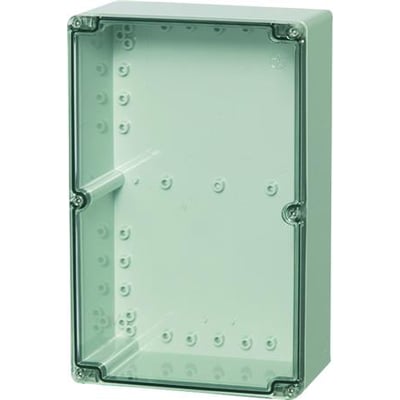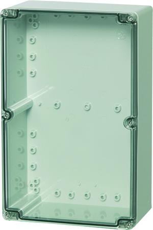 Montageboks i polycarbonat med transparente låg. Mål: 164 x 244 x 120 mm. IP66/IP67 klassificering.