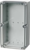 Kassebund med skruer til montageplade/DIN-skinne og transparent dæksel med PUR pakning og dækselskruer af rustfri stål.