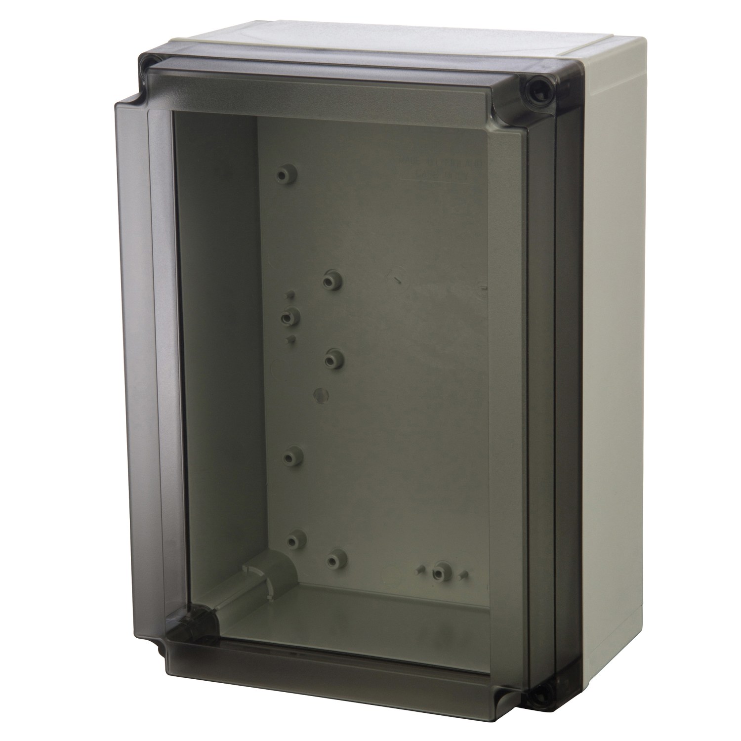Kassebund med PUR pakning, skruer til montageplade/DIN-skinne og dæksel med dækselskruer af polyamid. Extra høj kassebund, transparent røgfarvet dæksel.