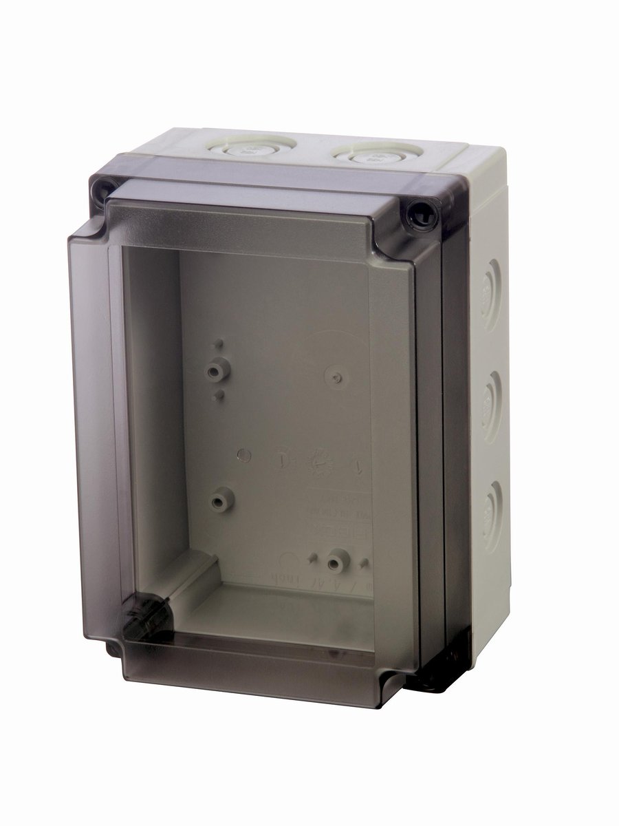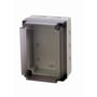 Polycarbonat montageboks (130 x 180 x 150 mm) med transparent røgfarvet dæksel. Opfylder IP66 og IP67 standarder.