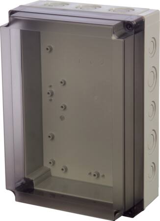 Robust montageboks i slagfast polycarbonat med transparent dæksel. IP66/67-klassificeret, ideel til krævende miljøer.