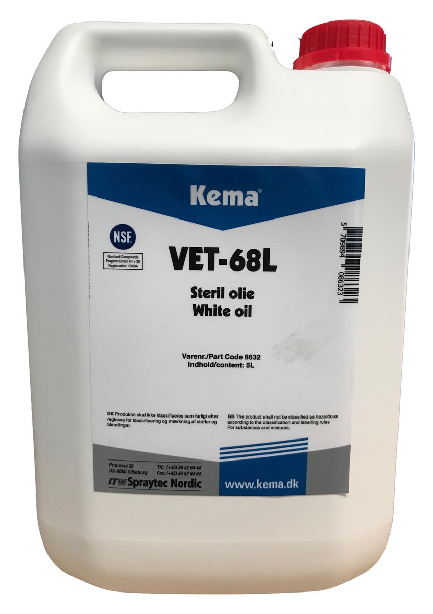 VET-68 fra Kema er en speciel raffineret, syrefri hvid olie, der opfylder de medicinske renhedskrav til brug indenfor fødevarevirksomheder, hospitaler og apoteker.