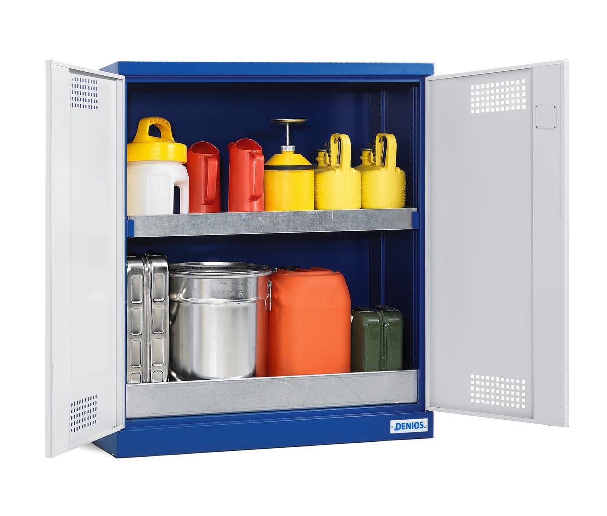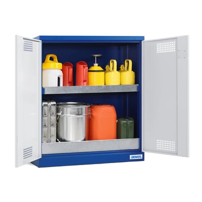 Sikkert kemikalieskab til opbevaring af vandforurenende og ikke-brændbare væsker samt giftstoffer. Stålplader med lakeret overflade. Blå korpus (RAL 5010) og lysegrå døre (RAL 7035).