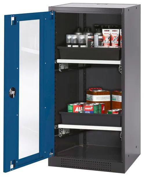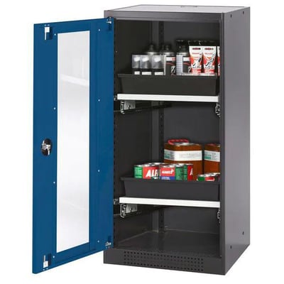 Fløjdøre med glasruder giver et hurtigt overblik over skabets indhold. Dørfarven er blå (RAL 5010) med dørstop til venstre.