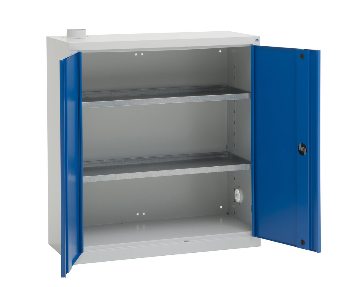 Kemikalieskab KS-0.5 med tallerkenventil, afgangsstuds til Ø 100 mm slange og 2 galvaniserede hylder. Lysningsmål: H:945 B:920 D:425 mm. Udv. mål: H:1075 B:1000 D:445 mm.