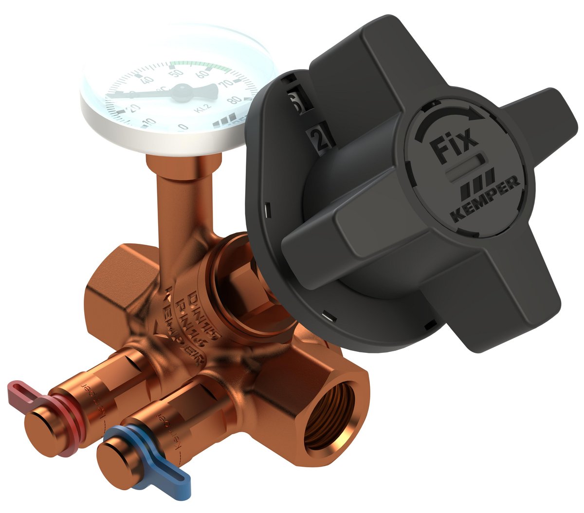 Kemper Multi-Fix-Plus er en regulerings- og balanceringsventil med indbygget termometer og tømmeprop. Den er designet til hydraulisk, fast anlægsjustering.