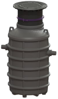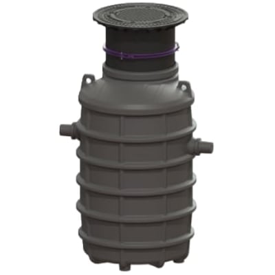 Kessel fedtudskiller til nedgravning med 400 l integreret slamfang. Med teleskopisk justerbart forhøjerstykke (550-950 mm) og lugttæt, låsbart dæksel (B125).