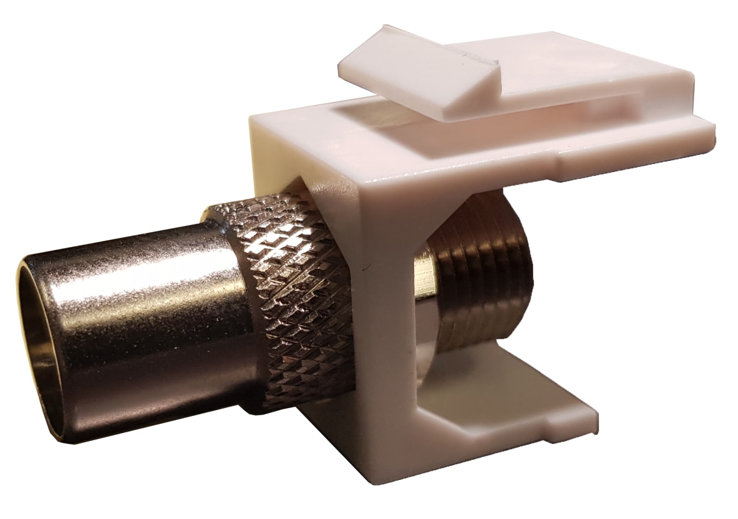 Keystone antenne adapter fra F-stik til IEC han. Til montage i standard Keystone hul 14,6 x 18,5mm.