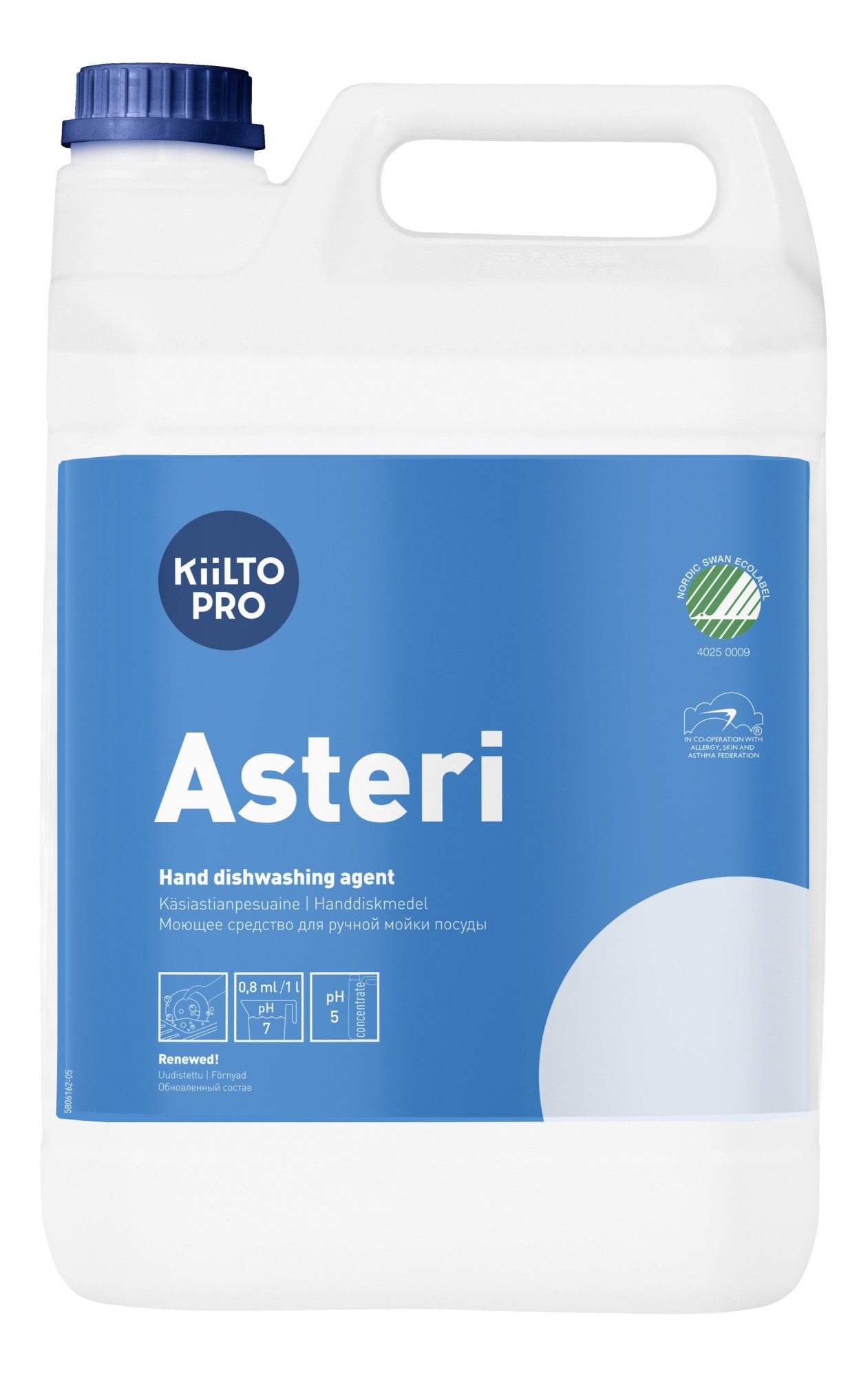 Kiilto Pro Asteri er et svanemærket opvaskemiddel, der er ideelt til håndopvask. Udover at være effektiv til opvask, er det også velegnet til rengøring af hårde overflader og vinduer.