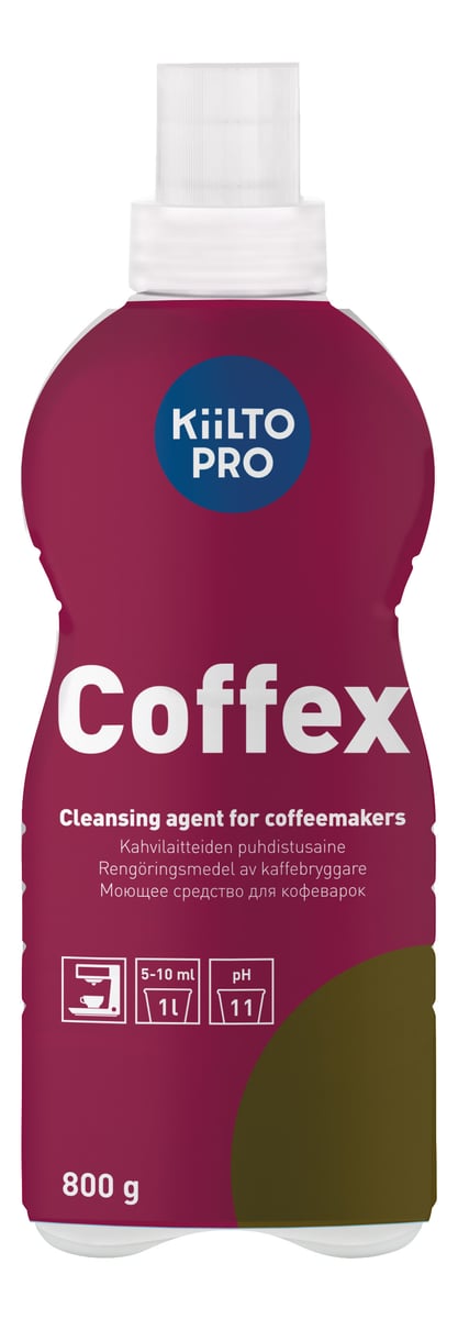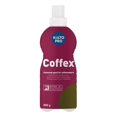 Kiilto Pro Coffex er et rensemiddel til rengøring af kaffebeholdere i kaffemaskiner, tebryggere, glasflasker, termoflasker m.m. Produktet bleger og fjerner effektivt pletter fra kaffe, te og mælk.