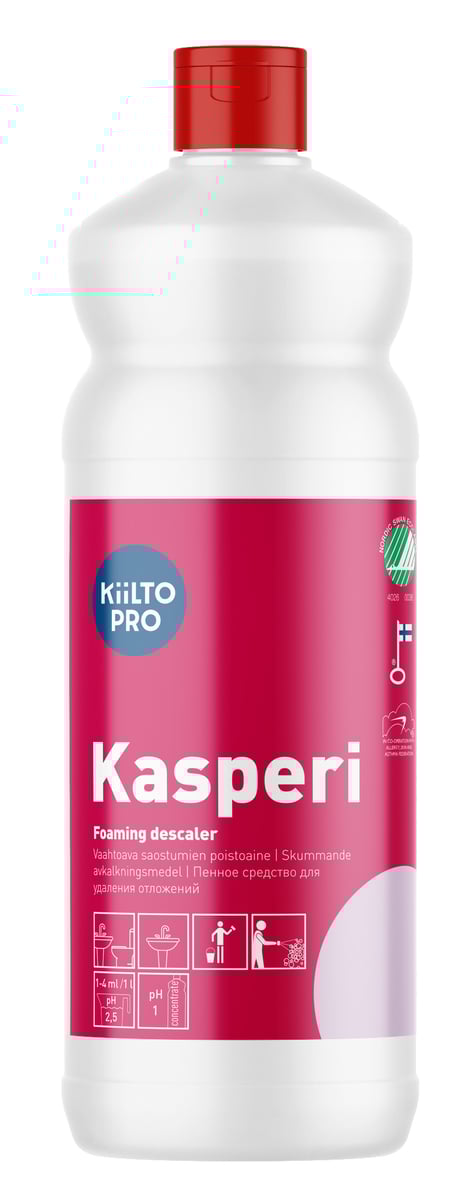 Kiilto Pro Kasperi er et svanemærket sanitetsrengøringsmiddel, der effektivt fjerner kalk og rust. Dette rengøringsmiddel er særligt velegnet til: