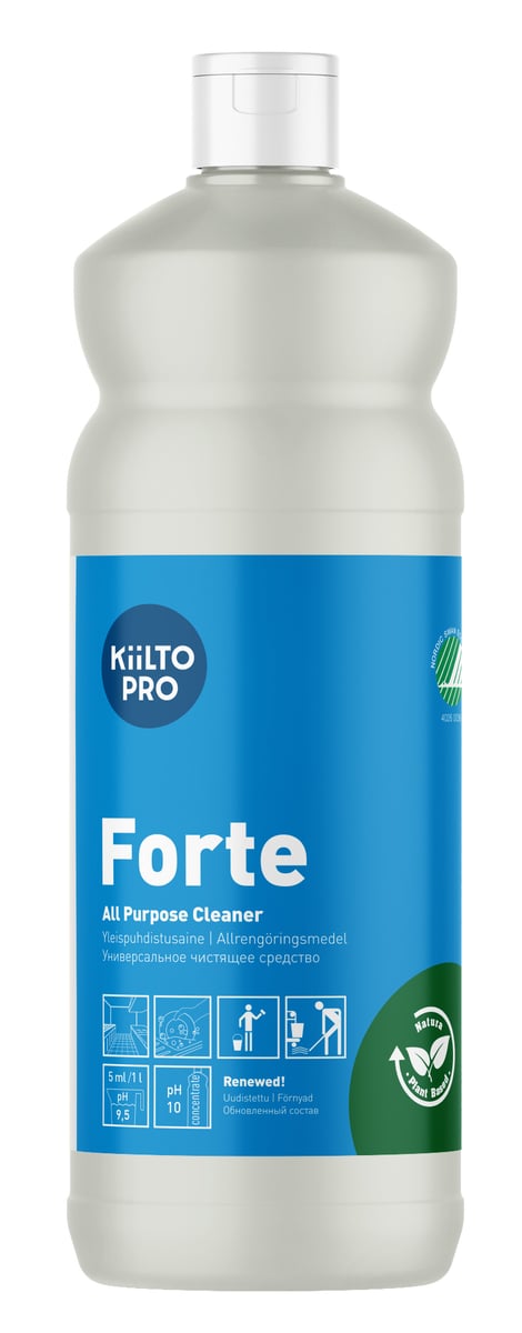 Kiilto Pro Forte er et universalrengøringsmiddel, der er ideelt til daglig rengøring af overflader og køkkenudstyr. Det kan også anvendes til håndopvask.