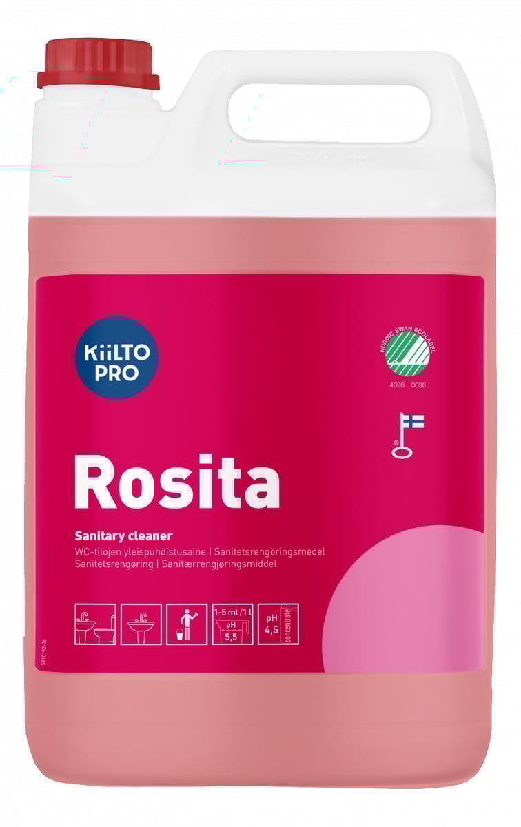 Kiilto Pro Rosita er en svanemærket sanitetsrens, der er ideel til vedligeholdelsesrengøring i sanitære faciliteter. Den reducerer dannelsen af aflejringer ved regelmæssig brug og efterlader overflader skinnende rene uden dråbemærker.