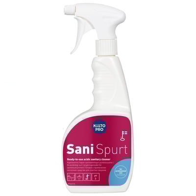 Kiilto Pro Sani Spurt er et klar-til-brug rengøringsmiddel til sanitære faciliteter. Fjerner let kalkrester, er nemt at anvende og efterlader en frisk duft.
