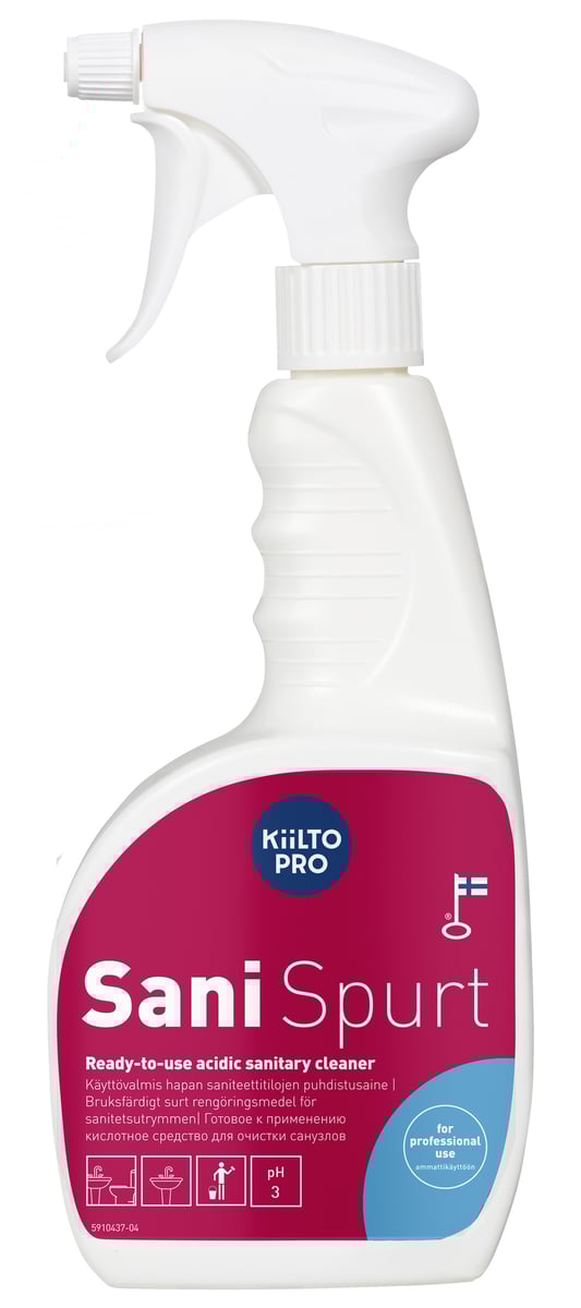 Kiilto Pro Sani Spurt er et effektivt rengøringsmiddel, der er klar til brug i sanitære faciliteter. Produktet fjerner let kalkrester og er baseret på en syreholdig formel.