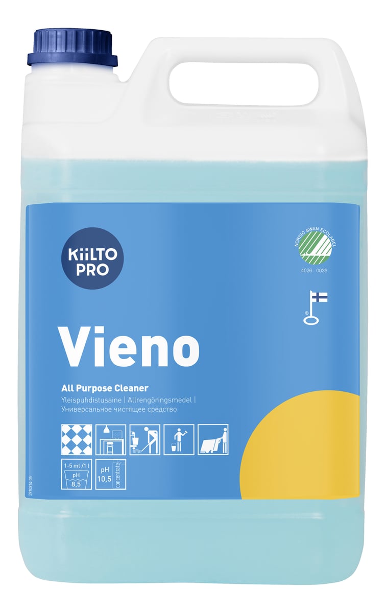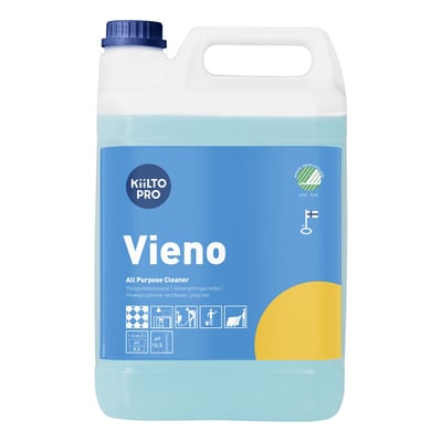 Kiilto Vieno er en svanemærket universalrengøring, der er ideel til vedligeholdelsesrengøring af hårde overflader. Produktet kan anvendes både manuelt og i rengøringsmaskiner.
