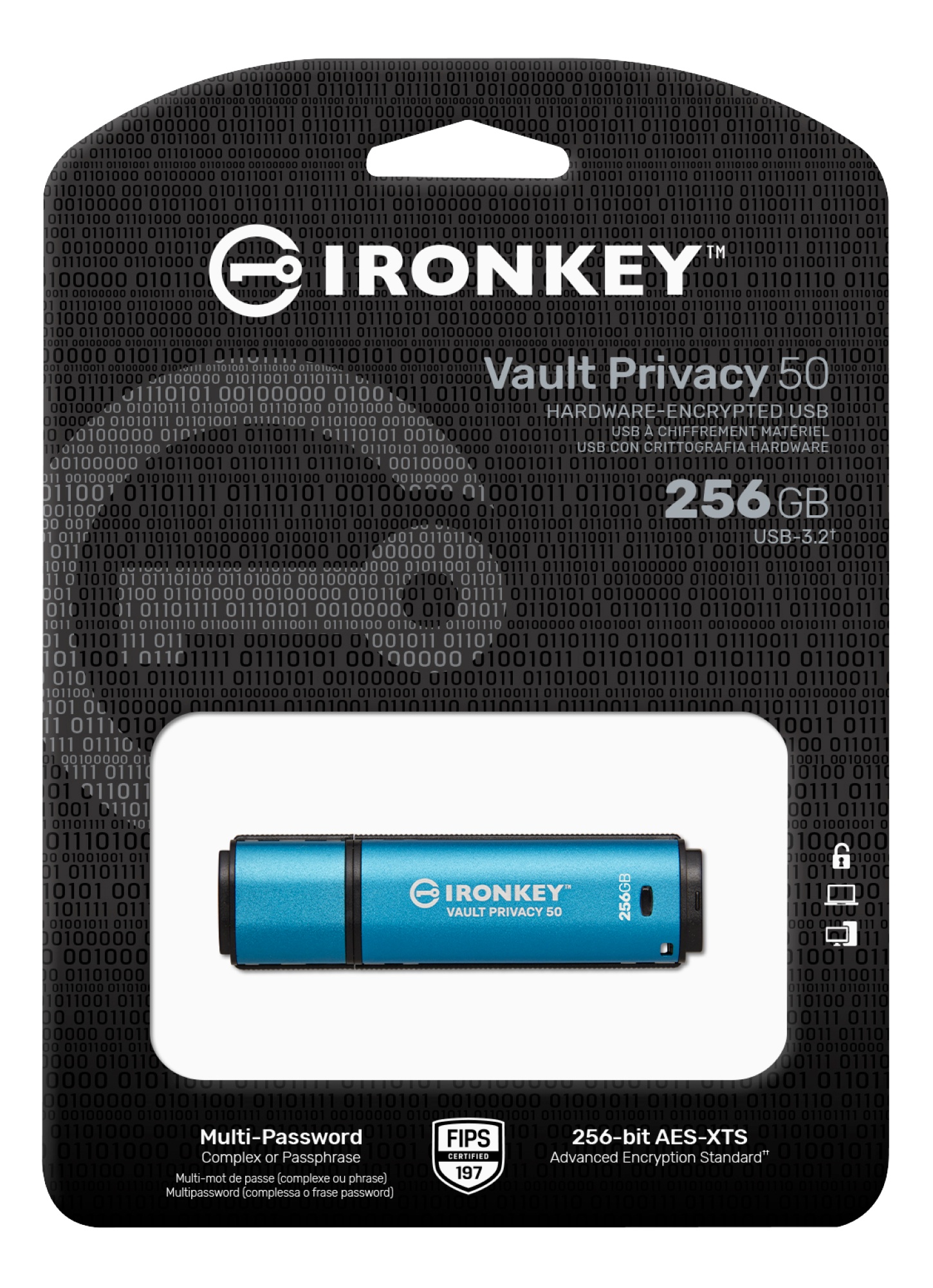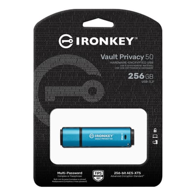 IronKey Vault Privacy 50 serien fra Kingston er premium USB-drev, der tilbyder enterprise-grade sikkerhed. Disse drev er udstyret med FIPS 197 certificeret AES 256-bit hardware-kryptering i XTS mode.
