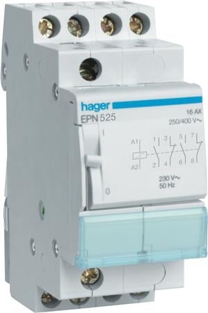 Hager kiprelæ, 230V, 3 sluttekontakter + 1 brydekontakt, 2 modul, EPN546