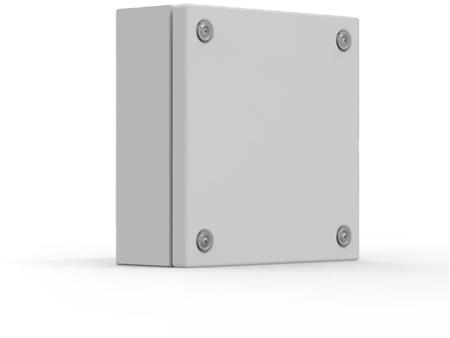 Klemkasse i 1.2 mm lakeret stål med fire huller til vægmontering og M6x13 studser til montageplade. Tæthedsgrad: IP66 og slagstyrke IK08.